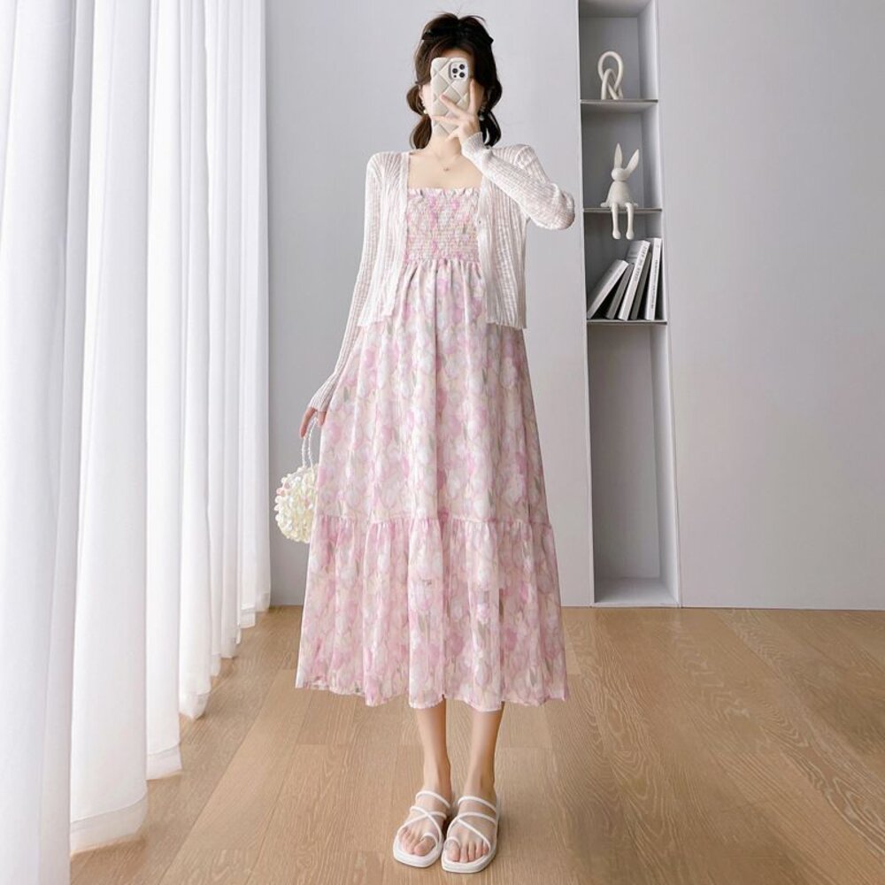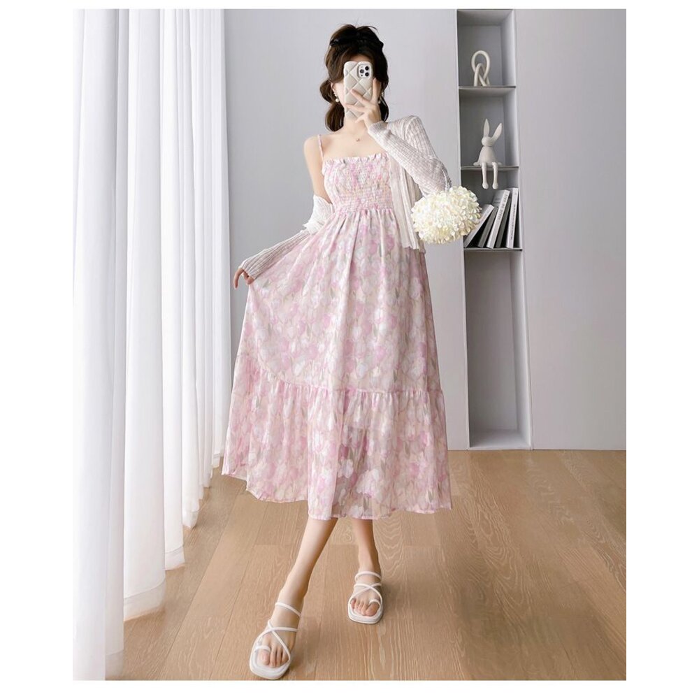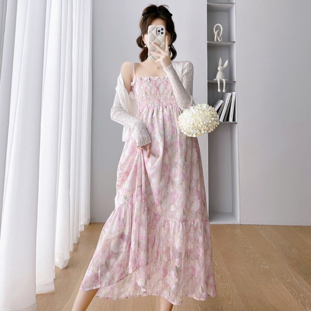 商品資訊/尺寸F/顏色.照片色/材質.雪紡/ (不含針織外套) 規格尺寸. 洋裝. F.裙長.98公分不含吊帶/鬆緊胸圍.112公分/ 商品會因不同批製作的因素,而有尺寸及顏色上些許落差,尺寸測量正負2公分為正常範圍內喔! 其他資料平放測量平面尺寸
