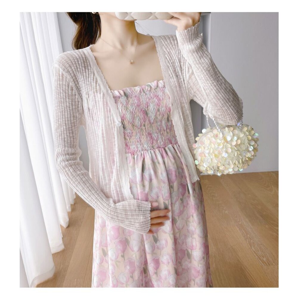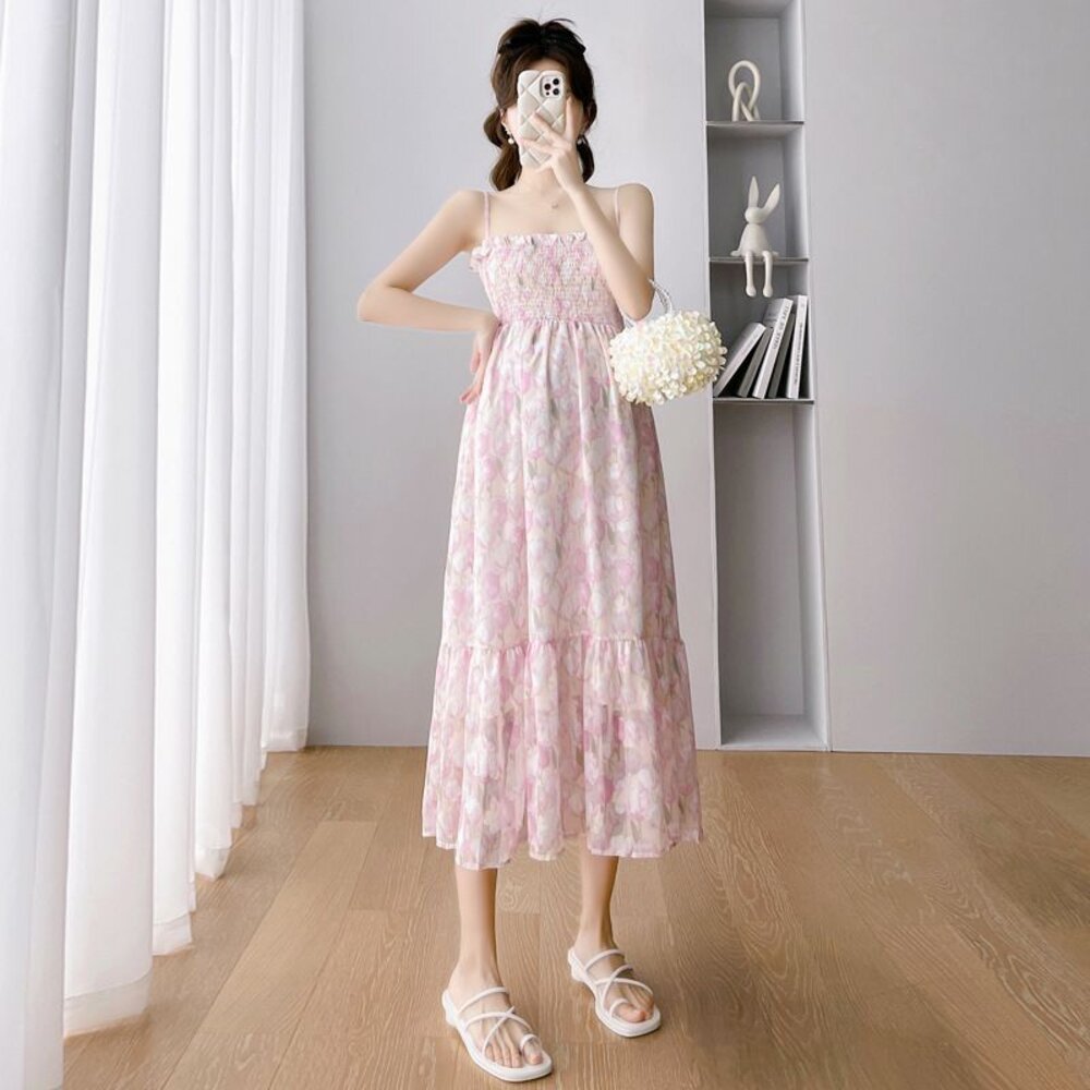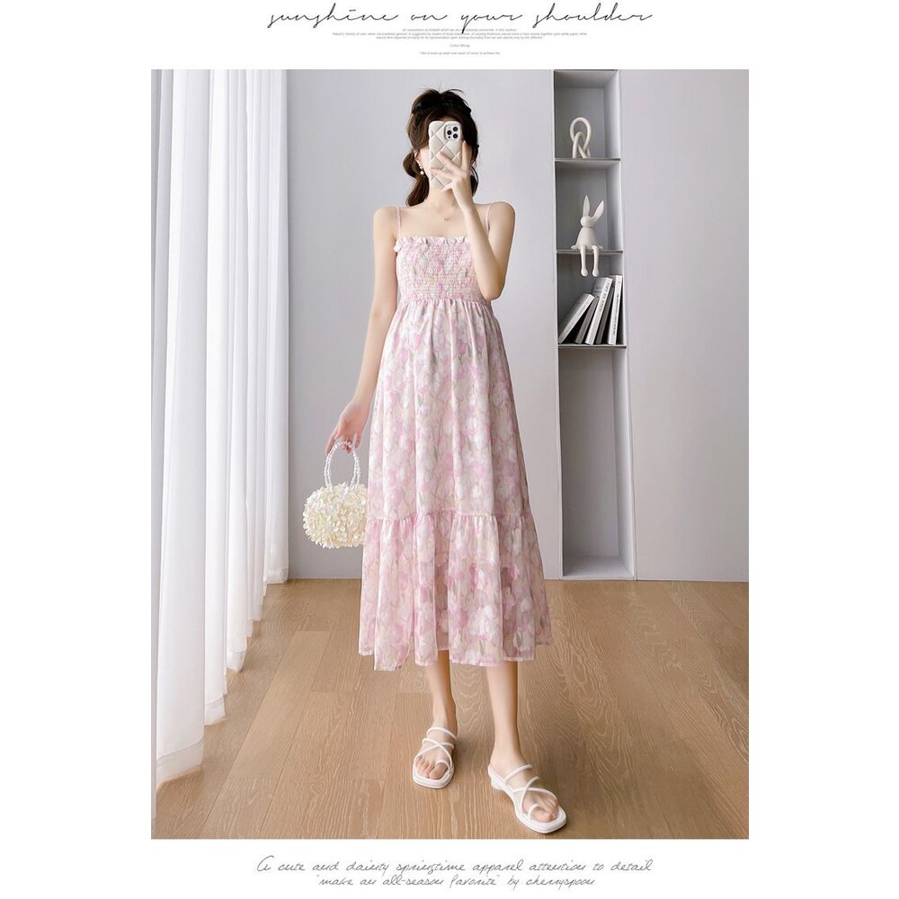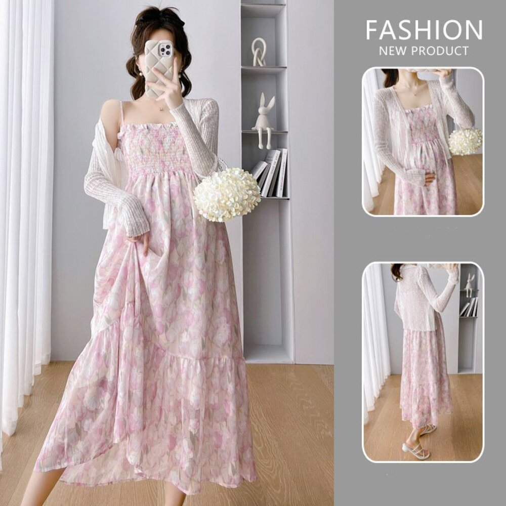 商品資訊/尺寸F/顏色.照片色/材質.雪紡/ (不含針織外套) 規格尺寸. 洋裝. F.裙長.98公分不含吊帶/鬆緊胸圍.112公分/ 商品會因不同批製作的因素,而有尺寸及顏色上些許落差,尺寸測量正負2公分為正常範圍內喔! 其他資料平放測量平面尺寸
