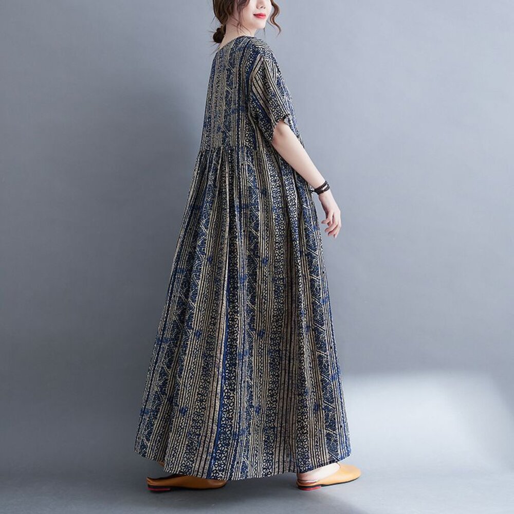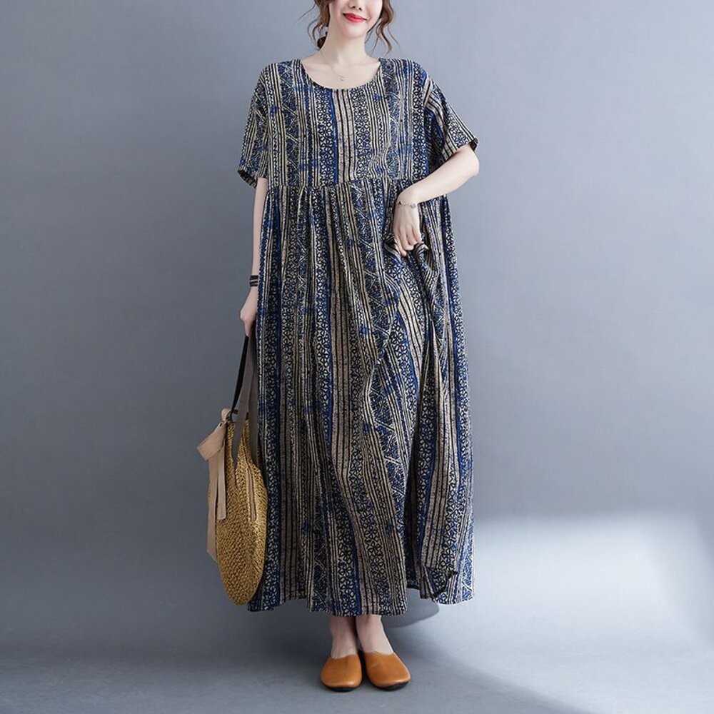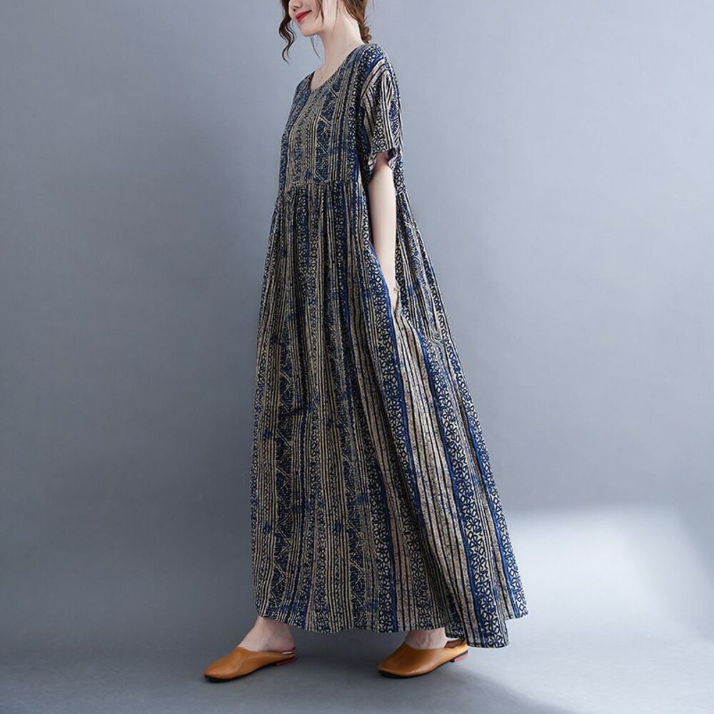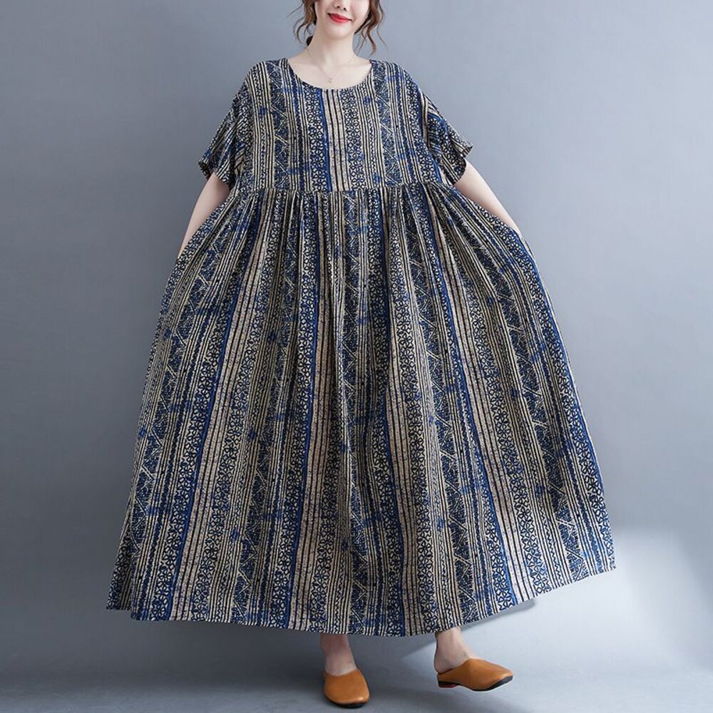 商品資訊/尺寸M-XL/顏色.照片色/材質.棉/ 規格尺寸. F.裙長.120公分/胸圍.142公分/肩寬.50公分/袖長.20公分/下襬.266公分 商品會因不同批製作的因素,而有尺寸及顏色上些許落差,尺寸測量正負2公分為正常範圍內喔! 其他資料平放測量平面尺寸