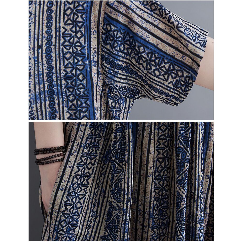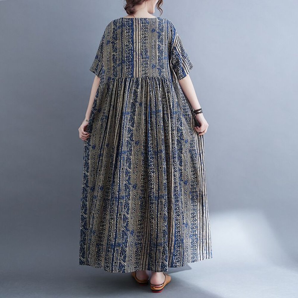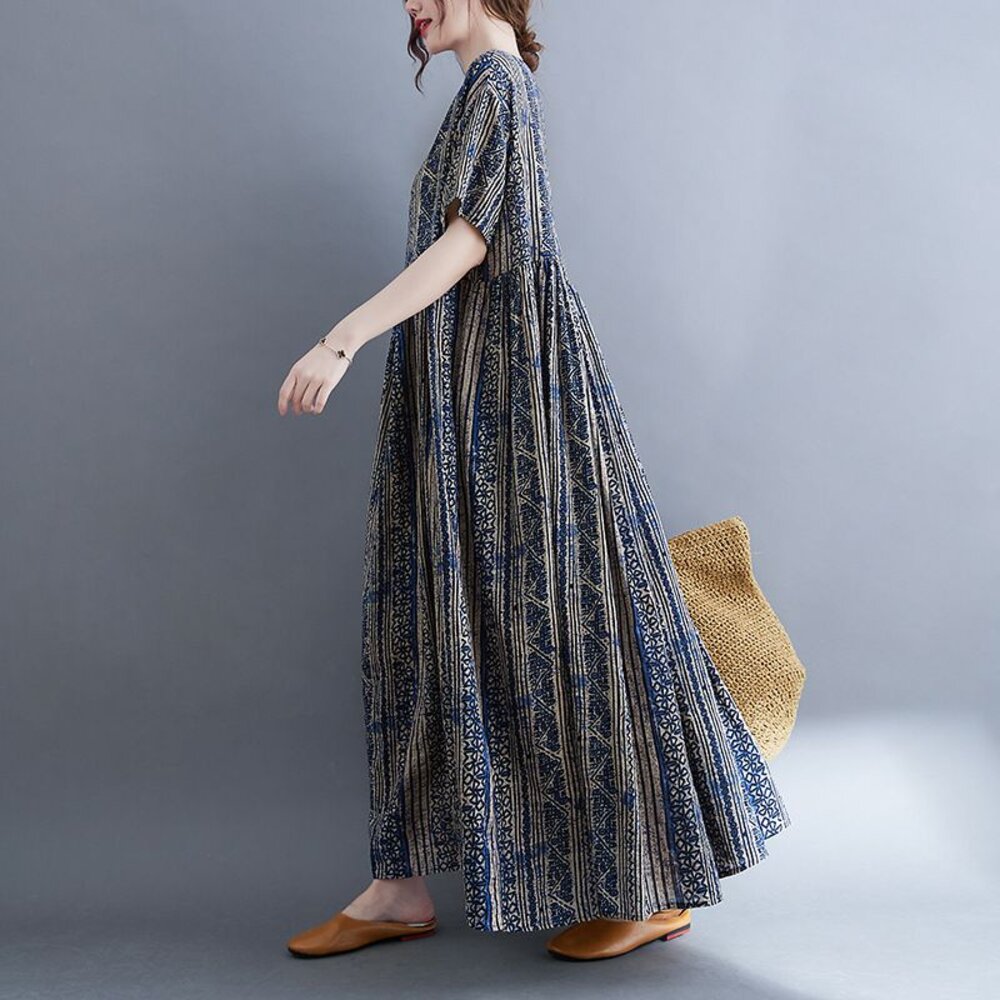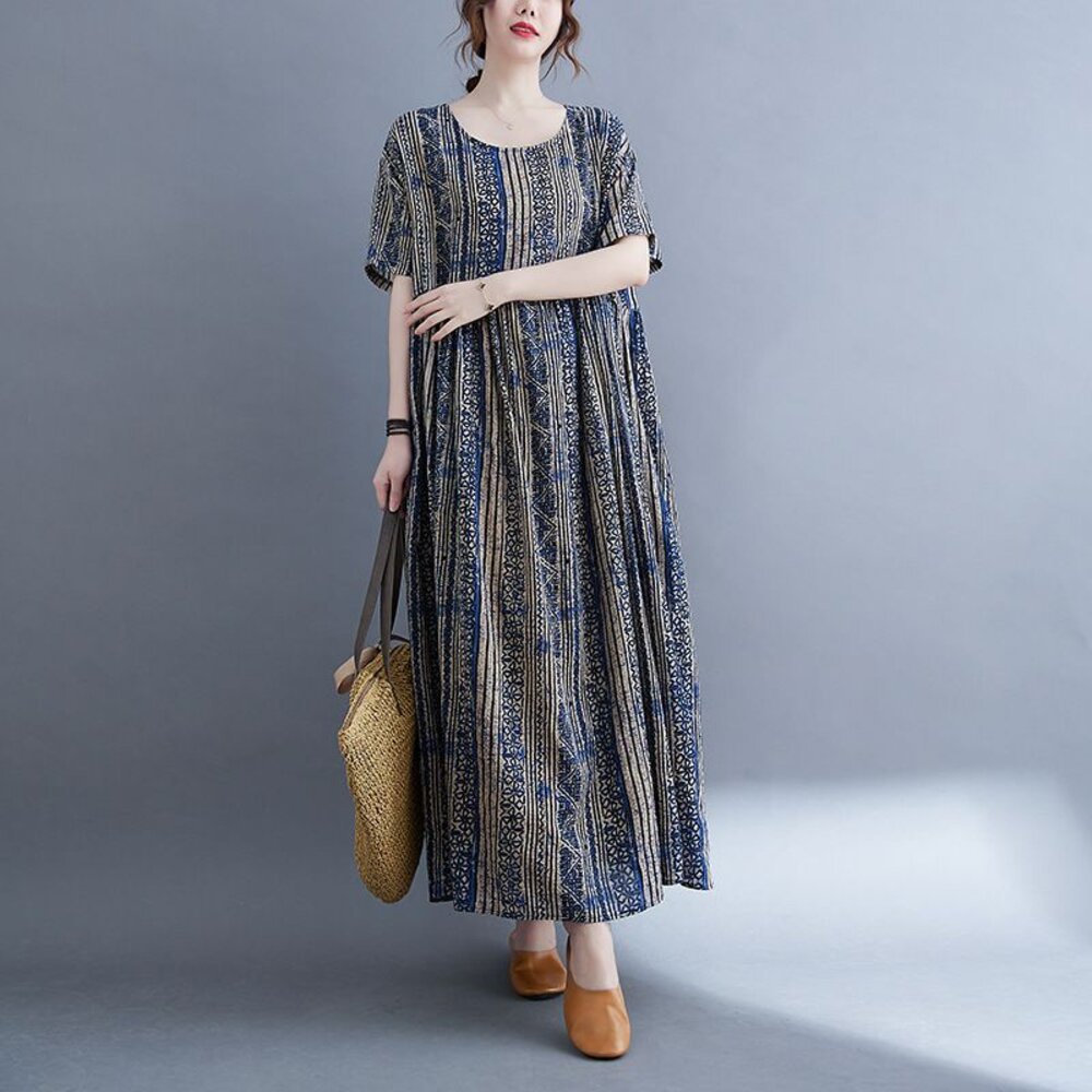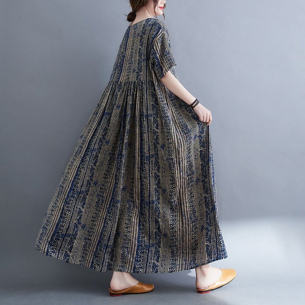 商品資訊/尺寸M-XL/顏色.照片色/材質.棉/ 規格尺寸. F.裙長.120公分/胸圍.142公分/肩寬.50公分/袖長.20公分/下襬.266公分 商品會因不同批製作的因素,而有尺寸及顏色上些許落差,尺寸測量正負2公分為正常範圍內喔! 其他資料平放測量平面尺寸